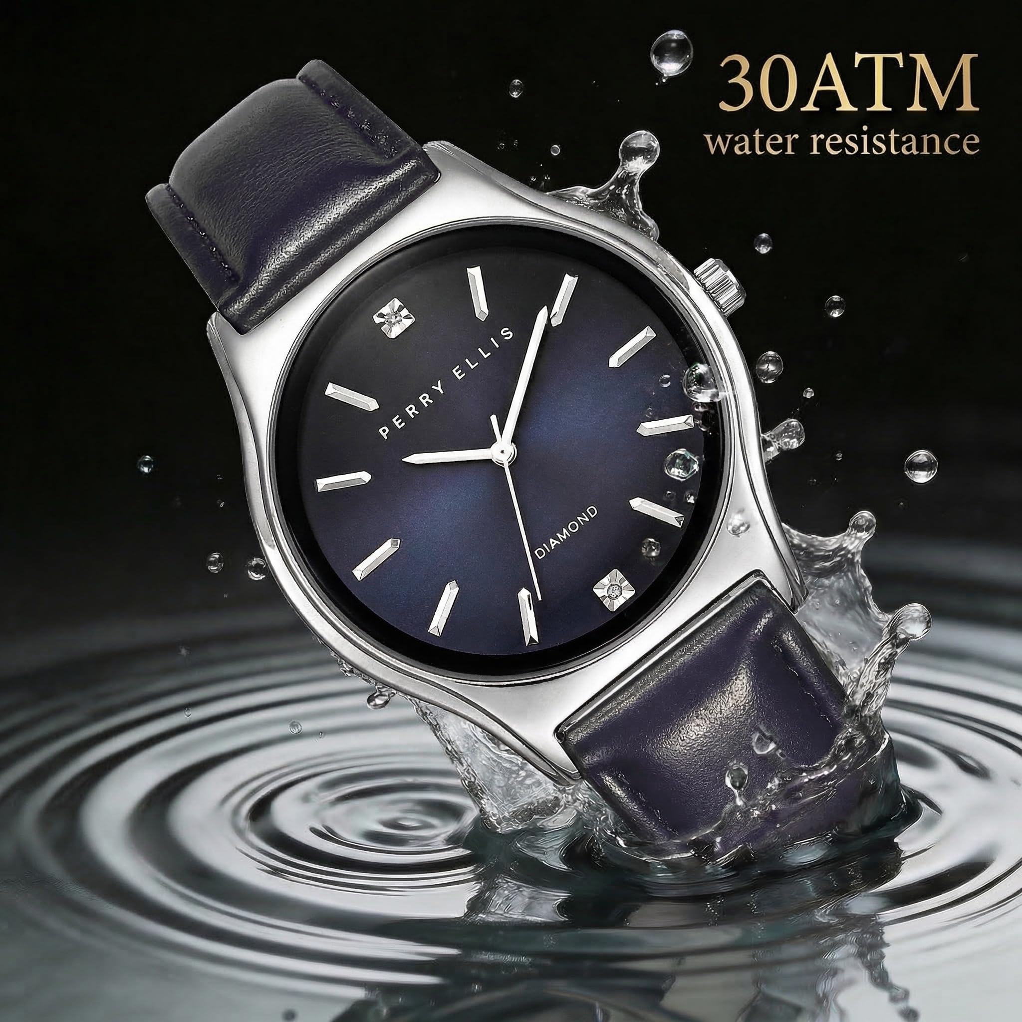Perry Ellis Ultra Slim Diamond Men’s Watch – Blue Sunray Dial, Silver Leather Strap, Water-Resistant Analog