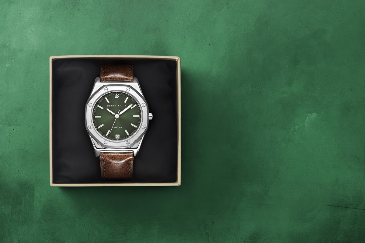 -33%Perry Ellis Ultra Slim Diamond Men’s Watch – Octagon Green Sunray Dial, Brown Leather Strap, Silver Finish, Water-Resistant—